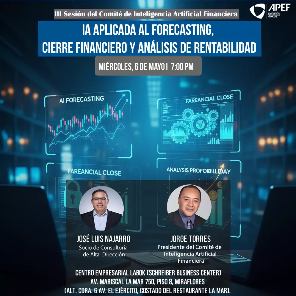 “IA aplicada al forecasting, cierre financiero y análisis de rentabilidad”, un enfoque práctico orientado a evidenciar cómo la inteligencia artificial permite mejorar la precisión de las proyecciones, optimizar los procesos de cierre y potenciar el análisis de rentabilidad, a partir de experiencias reales con sistemas de IA.