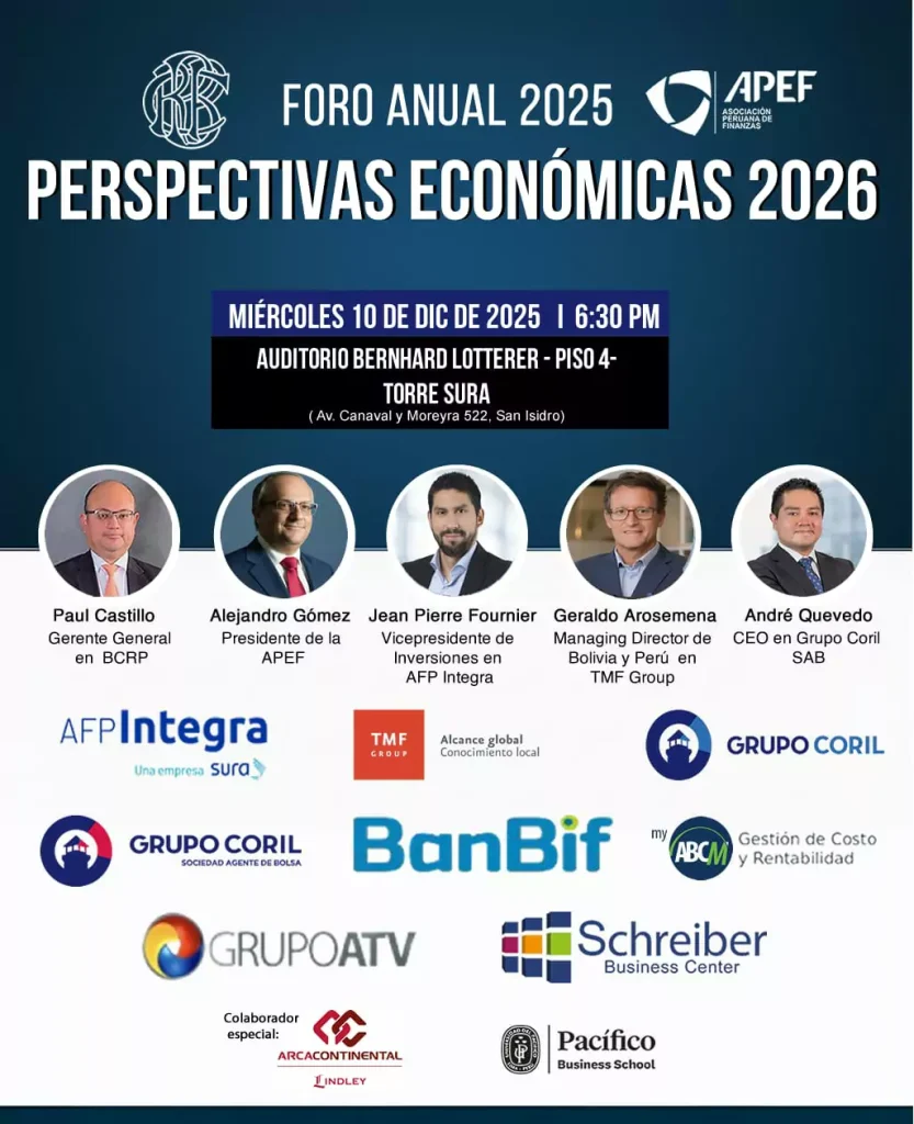 La Asociación Peruana de Finanzas, APEF, tiene el agrado de invitarlo a su Foro Anual 2025: “Perspectivas Económicas para el 2026”