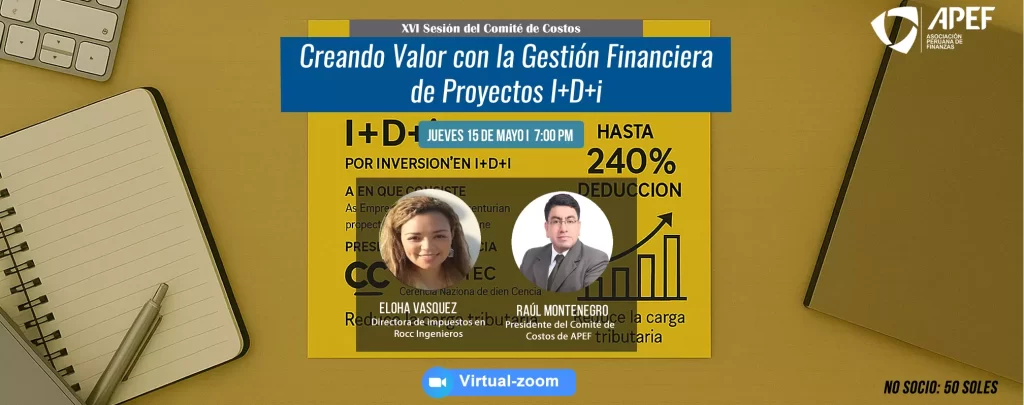 Creando Valor con la Gestión Financiera de Proyectos I+D+i. XVI Sesión del Comité de CostosExpositor: Eloha vasquez, Directora de impuestos en Rocc Ingenieros Moderador:Raúl Montenegro Vasquez, Presidente del Comité de costos de la APEF Día: Martes 15 de mayo de 2025 Hora: 7: 00 PMModalidad: Via plataforma zoom APEF Inscríbete ahora