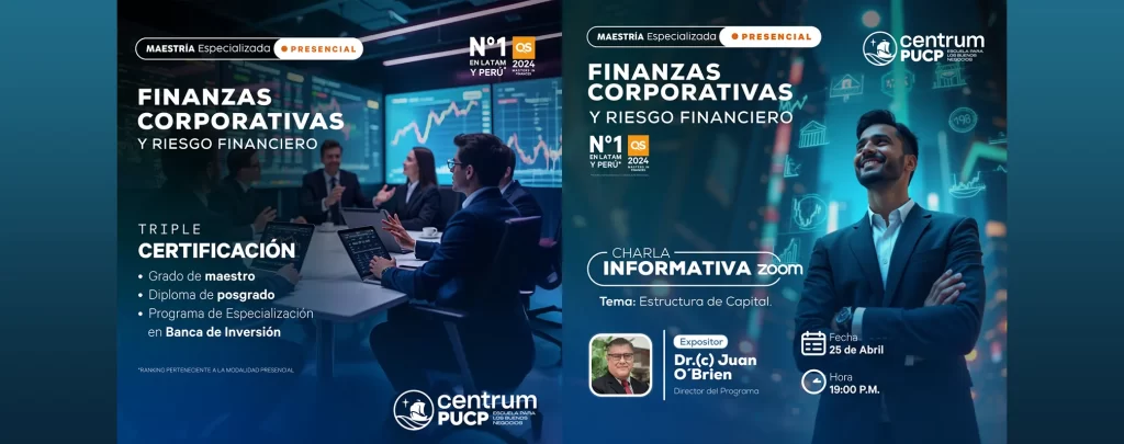 ¿Sabes cómo las grandes empresas deciden su combinación ideal de deuda y capital? Descúbrelo en nuestra Charla Informativa de la Maestría Especializada en Finanzas Corporativas y Riesgo Financiero de Centrum PUCP. Tema: Estructura de Capital Expositor: Dr.(c) Juan O’Brien – Director del Programa Fecha: Jueves 25 de abril Hora: 7:00 p.m. Modalidad: Zoom (virtual) Inscríbete aquí y separa tu lugar: https://info.centrum.pucp.edu.pe/LP=13372 Modalidad del programa: Presencial Maestría #1 en Latinoamérica y Perú según […]