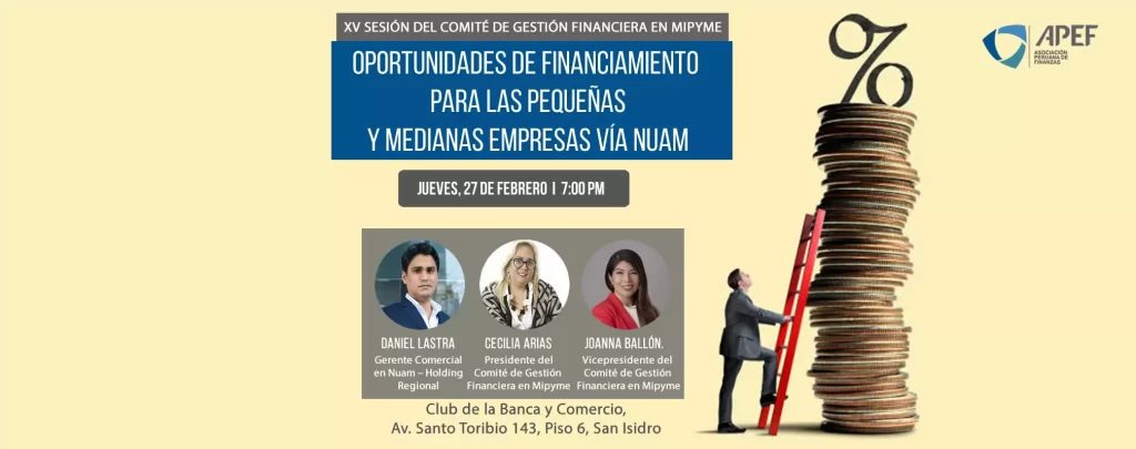 Oportunidades de Financiamiento para las pequeñas y medianas empresas vía nuam. XV sesión Comité de Gestión Financiera en Mipyme Tema: » Oportunidades de Financiamiento para las pequeñas y medianas empresas vía Nuam » Expositor: Daniel Lastra Preciado, Gerente Comercial en Nuam – Holding Regional Moderadores: Sra. Cecilia Arias, Presidente del Comité de GESTIÓN FINANCIERA EN MIPYME de la APEF Sra. Joanna Ballón, Vicepresidente del Comité de GESTIÓN FINANCIERA […]
