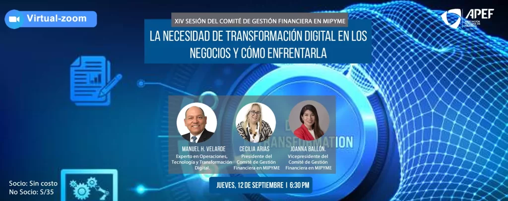 XIV SESIÓN DEL COMITÉ DE GESTIÓN FINANCIERA EN MIPYME La necesidad de Transformación Digital en los negocios y cómo enfrentarlaExpositor: Dr. Manuel H. Velarde, experto en Operaciones, Tecnología y Transformación Digital. Moderadores:Sra. Cecilia Arias, Presidente del Comité de GESTIÓN FINANCIERA EN MIPYME de la APEF Sra. Johanna Ballón, Vicepresidente del Comité de GESTIÓN FINANCIERA EN MIPYME de la APEF Día: Jueves, […]