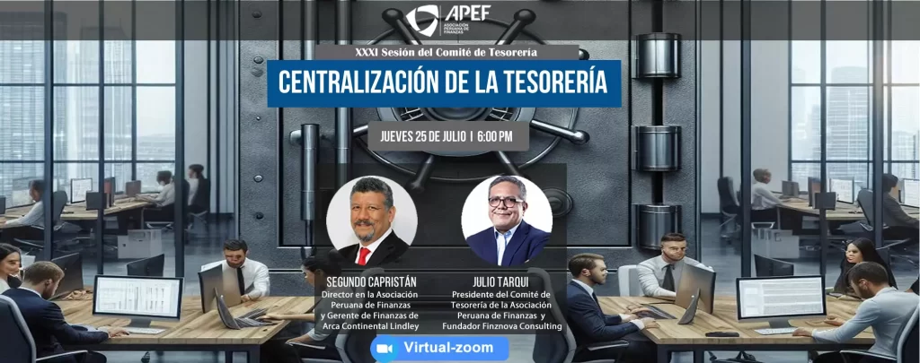 Centralización de la Tesorería XXXI Sesión del Comité de Tesorería.Expositor: Sr. Segundo Capristán Núñez, Director en la Asociación Peruana de Finanzas y Gerente de Finanzas de Arca Continental Lindley Moderador:Sr. Julio Tarqui Del Castillo, Presidente Comité de Tesorería de la APEF Día: Jueves 25 de julio de 2024Hora: 7PMModalidad: Conversatorio via plataforma zoom APEF Inscripciones – Haz clic aquí