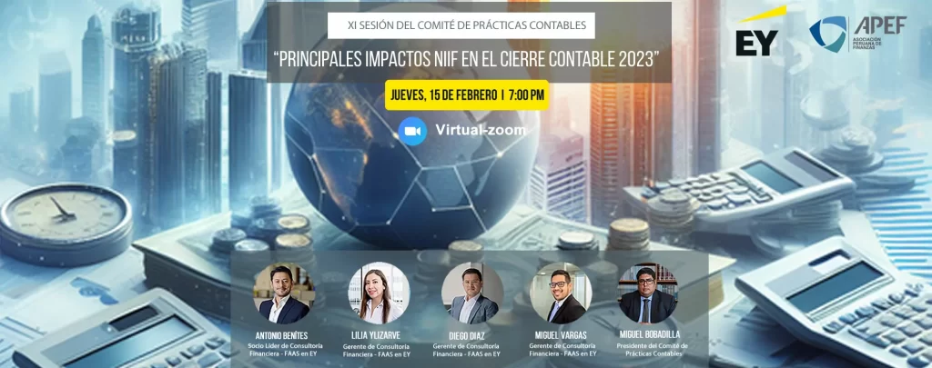 Principales impactos NIIF en el cierre contable 2023 XI SESIÓN DEL COMITÉ DE PRÁCTICAS CONTABLESTema: «Principales impactos NIIF en el cierre contable 2023»Expositor: Antonio Benítes, Socio Líder de Consultoría Financiera – FAAS en EYLilia Ylizarve, Gerente de Consultoría Financiera – FAAS en EYDiego Diaz, Gerente de Consultoría Financiera – FAAS en EYModerador: Miguel Bobadilla, Presidente del Comité […]