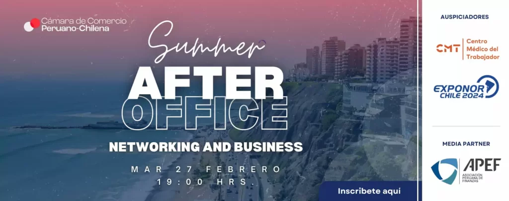Summer After Office Networking and Business La Cámara de Comercio Peruano Chilena Martes 27 de febrero a las 5:30 p.m., en la terraza del Hotel Hyatt Centric San Isidro Lima El evento reúne a las empresas líderes del ecosistema empresarial en un ambiente propicio para las oportunidades comerciales, con la participación de invitados especiales, proporcionará […]