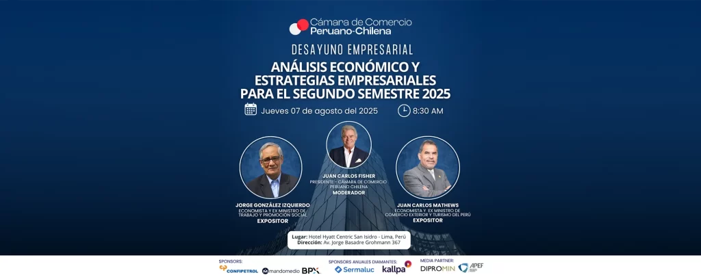 La Cámara de Comercio Peruano-Chilena te invita al Desayuno Empresarial: «Análisis Económico y Estrategias Empresariales para el Segundo Semestre 2025» Fecha: miércoles 07 de agosto Hora: 08:30 a.m. Lugar: Salón Camu Camu – Hotel Hyatt Centric, San Isidro Dirección: Av. Jorge Basadre Grohmann 367 Un espacio ideal para escuchar perspectivas clave de líderes económicos y fortalecer tu red de contactos. […]
