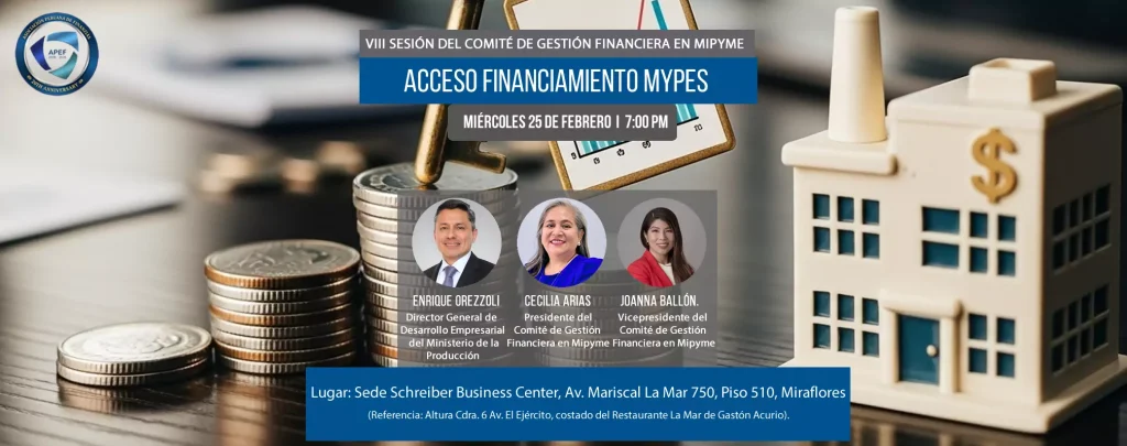 Acceso Financiamiento MypesVIII Sesión Comité de Gestión Financiera en Mipyme Tema: Acceso Financiamiento Mypes Expositor: Enrique Orezzoli, Director General de Desarrollo Empresarial en el Ministerio de la Producción del Perú Moderadores: Sra. Cecilia Arias, Presidente del Comité de GESTIÓN FINANCIERA EN MIPYME de la APEF Sra. Joanna Ballón, Vicepresidente del Comité de GESTIÓN FINANCIERA EN MIPYME de la APEF Día: Miércoles 25 de febrero de 2026 […]