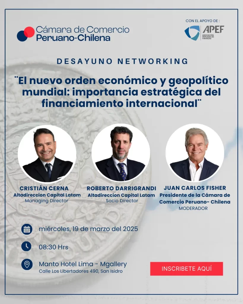 La Cámara de Comercio Peruano-Chilena te invita a participar de este exclusivo desayuno – networking: «El nuevo orden económico y geopolítico mundial: importancia estratégica del financiamiento internacional«