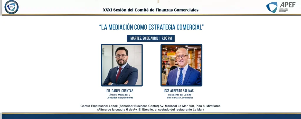 XXXI Sesión del Comité de Finanzas Comerciales “La mediación como estrategia comercial” Expositor invitadoDr. Daniel CuentasÁrbitro, Mediador y Consultor Independiente ModeradorJosé Salinas LostaunauPresidente del Comité de Finanzas Comerciales Objetivo: Posicionar la mediación como una estrategia comercial eficaz que optimiza la gestión de conflictos,incidiendo principalmente en los costos, generando valor sostenible en las decisiones financieras y comerciales. […]