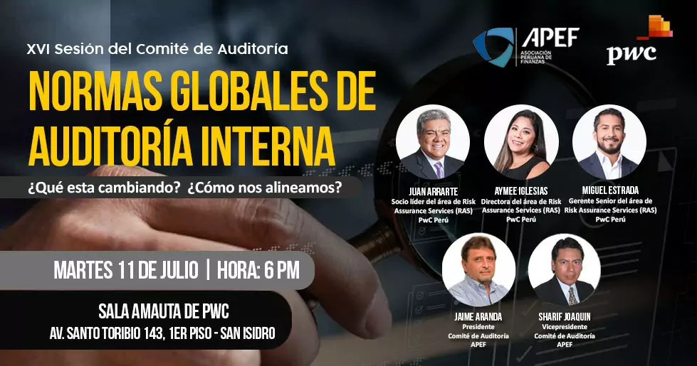 Normas Globales de Auditoría Interna ¿Qué está cambiando? ¿Cómo nos alineamos? XVI Sesión del Comité de Auditoría Fecha: Miércoles 11 de julio de 2023 | Hora: 6 p.m.Lugar: Sala Amauta de PwC Av. Santo Toribio 143, 1er piso, San Isidro. Inscripciones Aquí Inscripciones Aquí