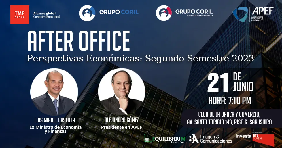 AFTER OFFICE Perspectivas Económicas: Segundo Semestre 2023 Día: Miércoles 21 de junio de 2023 | Hora: 7:10 p.m. Lugar: Club de la Banca y Comercio, Av. Santo Toribio 143, Piso 6, San Isidro. Inscripciones Aquí