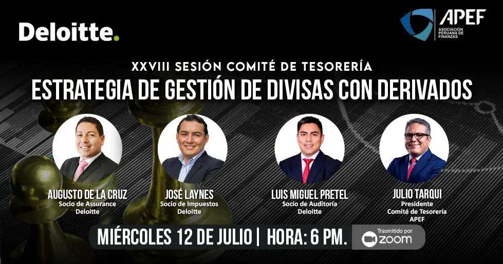 Estrategia de gestión de divisas con derivados XXVIII Sesión Comité de Tesorería Fecha: Miércoles 12 de julio de 2023 | Hora: 6 p.m.Via Plataforma Zoom APEFObjetivos: Administración del riesgo de divisas Derivados Alcance contable y tributario de derivados Inscripciones Aquí Inscripciones Aquí