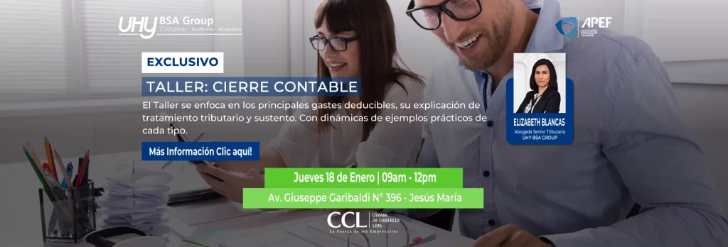 Taller: Cierre Contable Enfocado en los principales gastos deducibles, su explicación de tratamiento tributario y sustento, además de ejemplos prácticos de cada tipo, bajo la exposición de la Srta. Elizabeth Blancas, Abogada Senior en UHY BSA Group. Día: jueves 18 de enero deHora: De 9:00 a 12:00 hrs.Lugar: Cámara de Comercio de Lima.En: Av. Giusseppe […]
