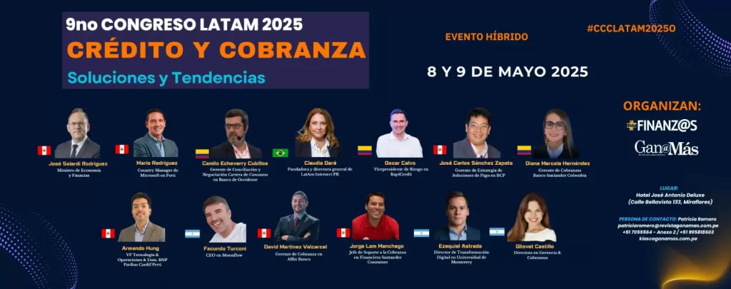 ¡Prepárate para el Congreso Latam 2025 de Crédito y Cobranza! El 8 y 9 de mayo de 2025, desde Lima-Perú, reunimos a expertos, innovadores y líderes del sector para explorar los avances y retos más importantes en el mundo del crédito y la cobranza. En un entorno cada vez más digital y dinámico, este congreso te brindará las herramientas más innovadoras y estrategias clave para optimizar procesos, mejorar la recuperación de cartera y ofrecer una experiencia excepcional a tus clientes. No pierdas la oportunidad de formar parte de este evento único, donde podrás compartir experiencias, ampliar tu red de contactos y aprender de los mejores en la industria. ¡Inscríbete ahora y asegura tu lugar en el #CCCLATAM2025!