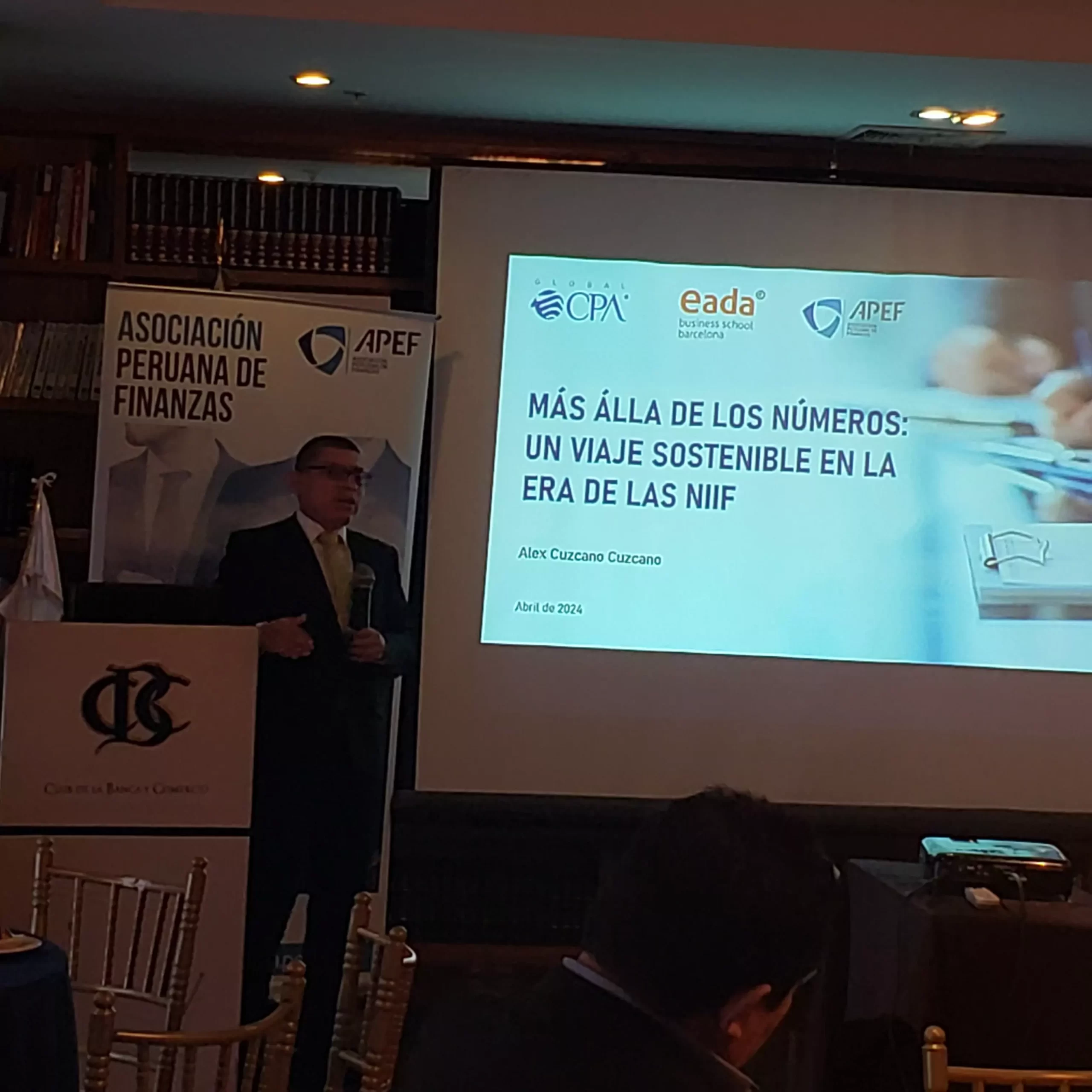 El jueves 25 de abril de 2024, se llevó a cabo con éxito el desayuno empresarial “Más allá de los números: un viaje sostenible en la era de los NIIF”, organizado por la Asociación Peruana de Finanzas (APEF) que contó con la participación de Daniel Pujol, Associate director of Admissions Online Division en EADA Business School Barcelona, auspiciador de este evento; Alex Cuzcano, Coordinador General de las DOM Perú ante la IFAC y director en Global CPA, y con la moderación de Segundo Caprístán Núñez, director ejecutivo en APEF.