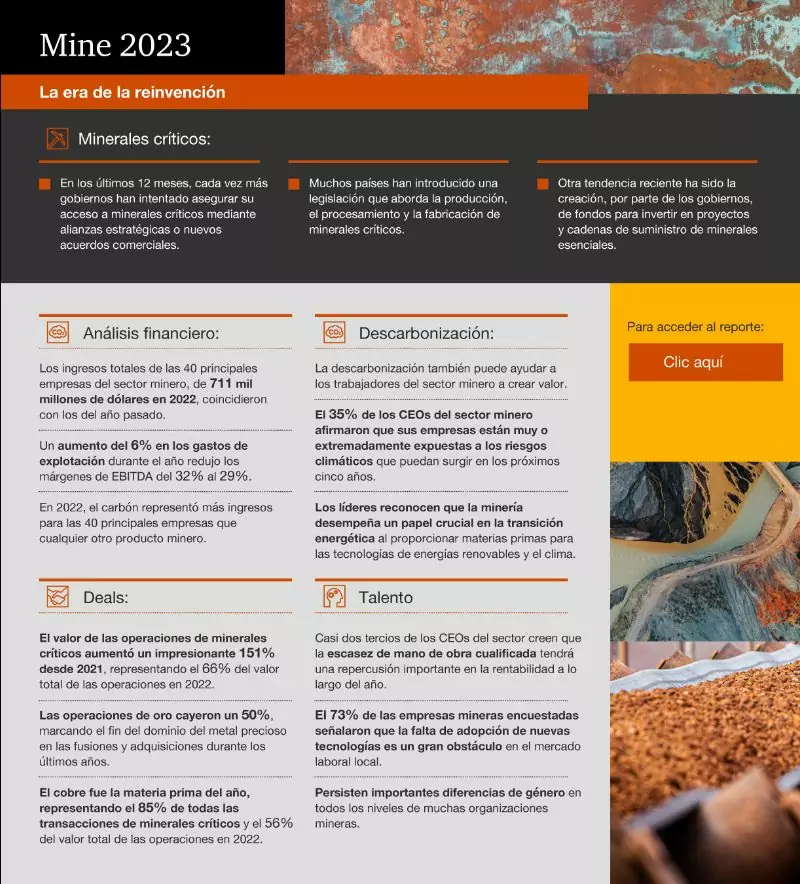 Según el Mine 2023 de PwC, los ingresos de la minería se mantuvieron estables en 711 mil millones de dólares en 2022, pero el aumento de los costes y la incertidumbre económica redujeron los márgenes EBITDA (Earnings Before Interest, Taxes, Depreciation, and Amortisation) del 32% al 29%. Las conclusiones del informe de este año recogen los principales temas y acontecimientos que afectan a la industria, especialmente el impacto de la transición energética, que dará forma al sector minero en las próximas dos décadas. Revisa todos los detalles aquí: