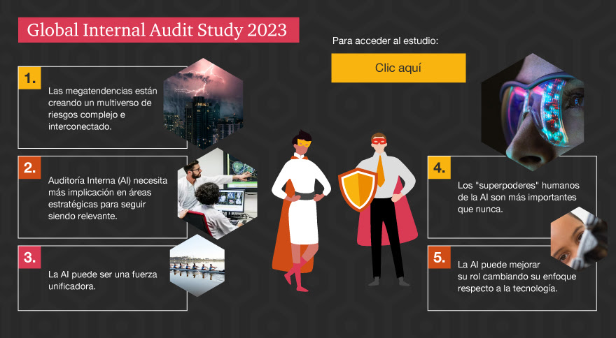 El Global Internal Audit Study 2023 de PwC, explora las opiniones de 4.680 líderes de Auditoría Interna (41%), miembros del consejo y ejecutivos del negocio (37%), y líderes de segunda línea de riesgos (11%) y cumplimiento (11%). Asimismo, abarcó 81 países de una amplia gama de sectores. Nuestra encuesta reveló cinco conclusiones convincentes. Cada una de ellas se analiza con más detalle en este informe, centrándose en por qué son importantes en la AI (Auditoría Interna) y sus partes interesadas, el valor para la organización y consejos prácticos para abordarlas. Revisa todos los detalles aquí: