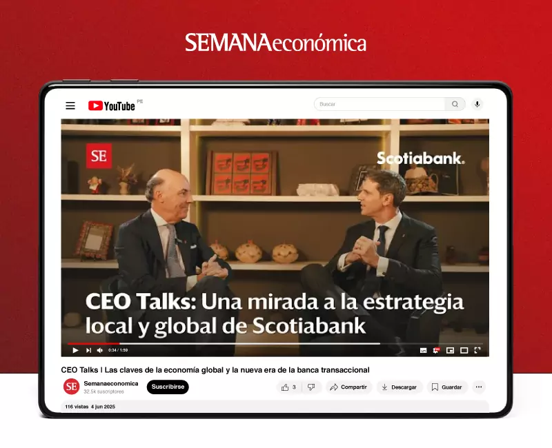 Sebastián Arcuri, CEO de Scotiabank Perú, y Francisco Aristeguieta, Group Head de Banca Internacional de Scotiabank, se reunieron en este CEO Talks para conversar sobre el presente de Scotiabank en nuestro país y en el mundo. Entérate de las perspectivas de estos líderes en el siguiente video.