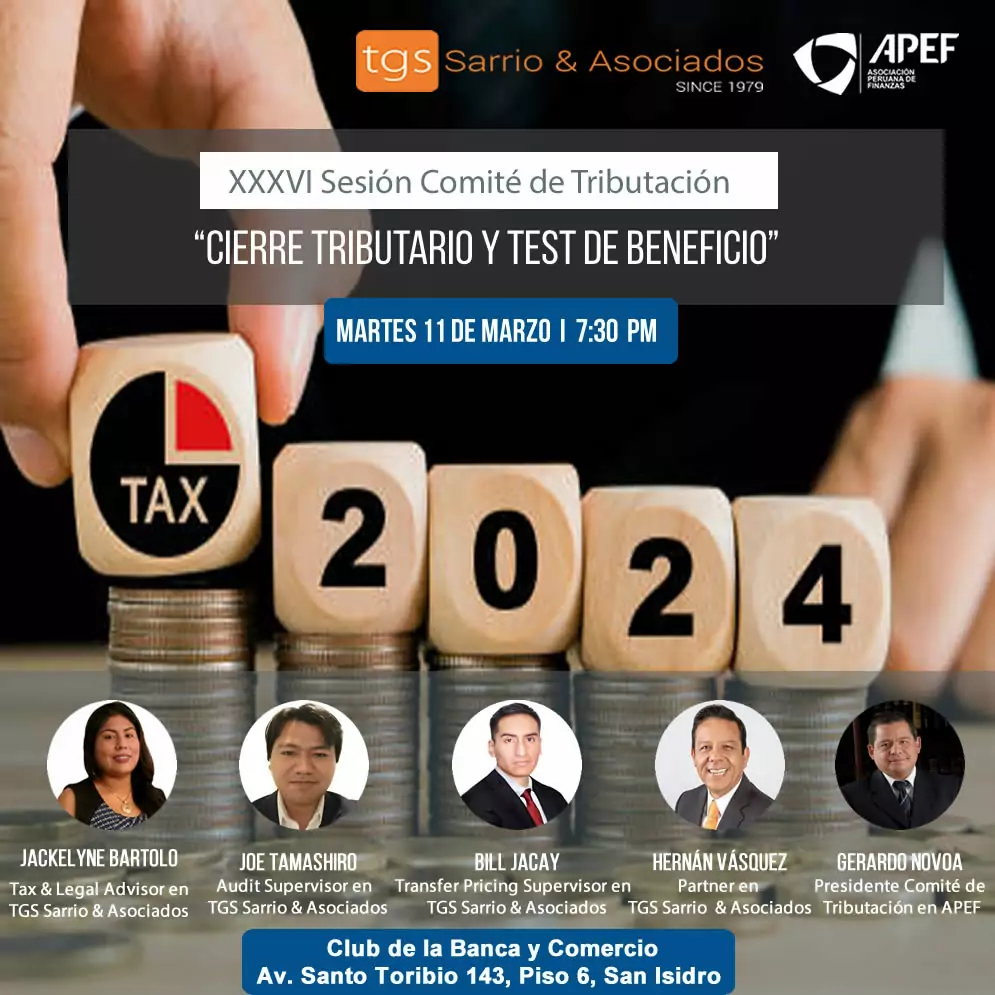 «Cierre Tributario y Test de Beneficio», con la exposición de los señores Jackelyne Bartolo Guerra, Tax & Legal Advisor; Joe Tamashiro Chira Audit Supervisor; Bill Jacay Peña Pricing Supervisor y Hernán Vásquez Alzamora Partner en TGS Sarrio & Asociados y Gerardo Novoa Herrera Presidente del Comité de Tributación en APEF.